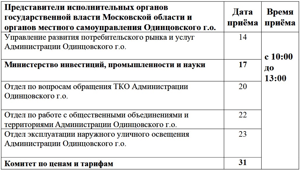 График личного приёма граждан в Общественной приёмной исполнительных органов государственной власти Московской области и органов местного самоуправления Одинцовского г.о. В ОКТЯБРЕ 2025г.