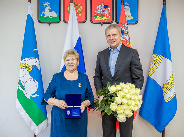 Андрей Иванов вручил медаль Одинцовского городского округа «За доблестный труд» ветерану Любови Николаевне Петровой — в этом году председатель Общественной организации ветеранов (пенсионеров) войны, труда, Вооружённых сил и правоохранительных органов Звенигорода отметила 70-летний юбилей.
