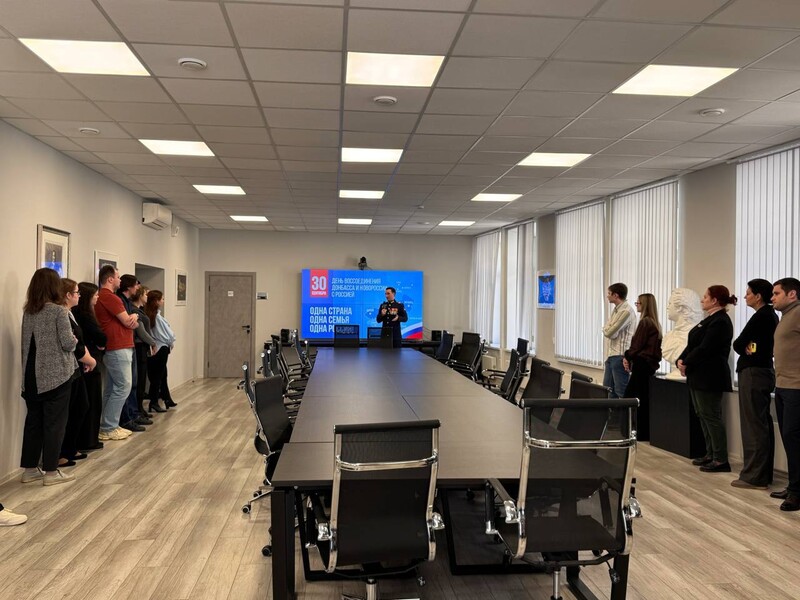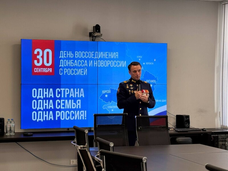 В честь праздника военнослужащий бригады специального назначения воздушно-десантных войск, гвардии сержант Александр Мирошник на встрече с коллективом Пробирной палаты рассказал о том, как важная дата отмечается на воссоединенных территориях: возложения цветов, установка памятных знаков и выставки.
