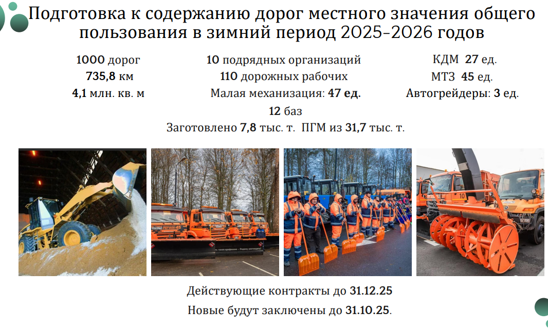 «В уборке будут задействованы десять подрядных организаций, — уточнил Михаил Пайсов. — Численность дорожных рабочих — 110 человек. В состав механизированной группировки входят 27 комбинированных дорожных машин, 45 тракторов МТЗ, 3 автогрейдера и 47 единиц малой механизации».