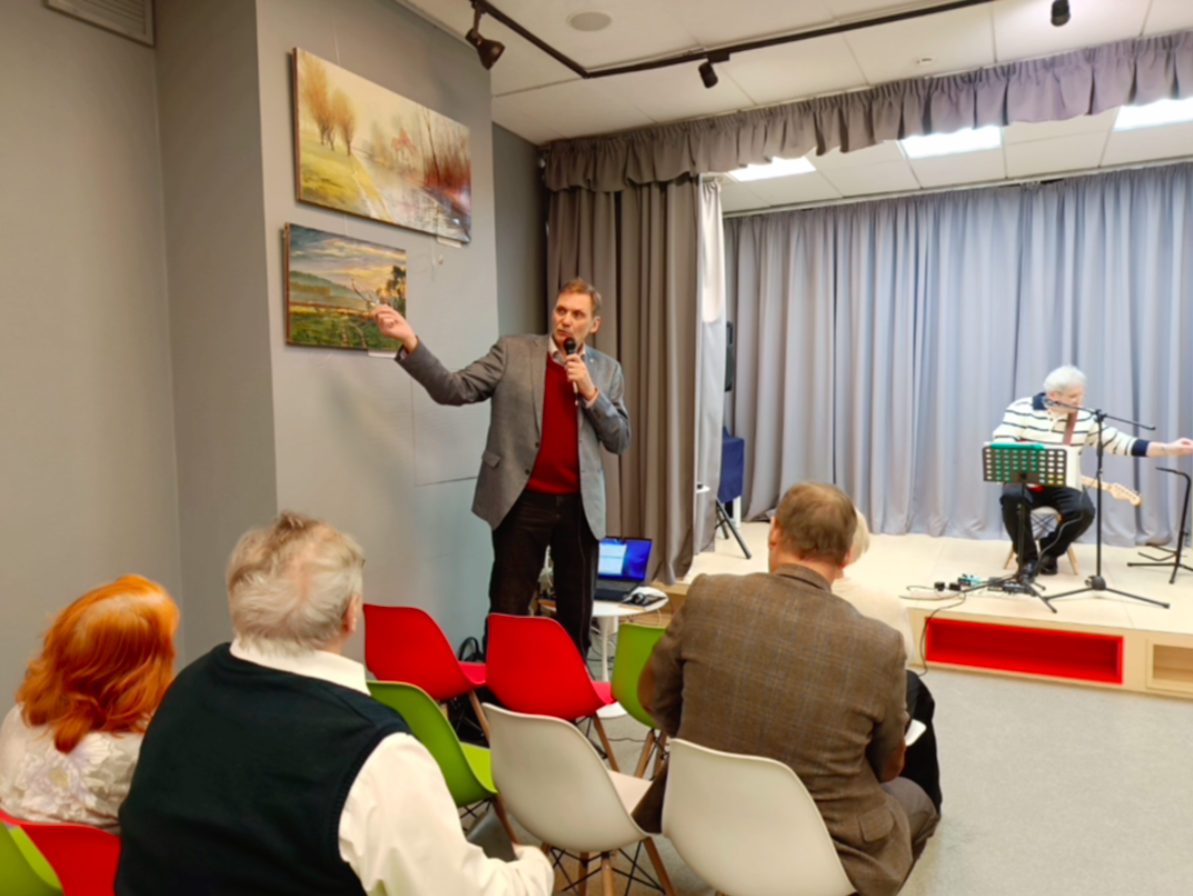 Визуальным сопровождением и полноправной частью вечера стали картины друга Валерия Дронова — художника Константина Иванова. Мастер рассказал о своём творческом пути и о том, как рождаются образы. Добавим, что его работы уже почти месяц радуют посетителей Одинцовской библиотеки: персональная выставка Константина Иванова «Пейзажи России» продлится до 14 февраля.
