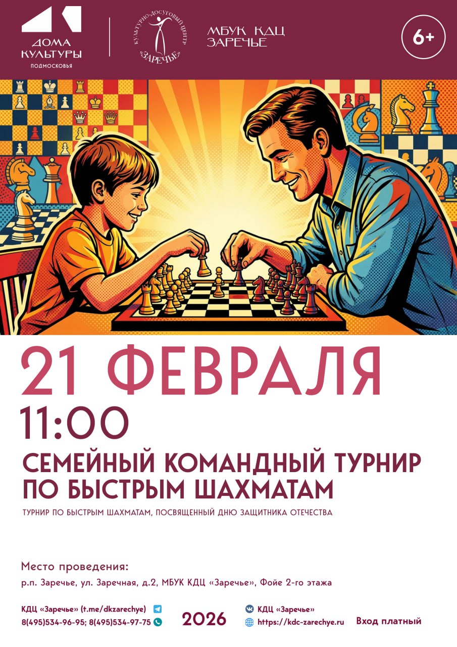 В субботу, 21 февраля, в КДЦ «Заречье» состоится семейный командный турнир по быстрым шахматам, посвященный Дню защитника Отечества.