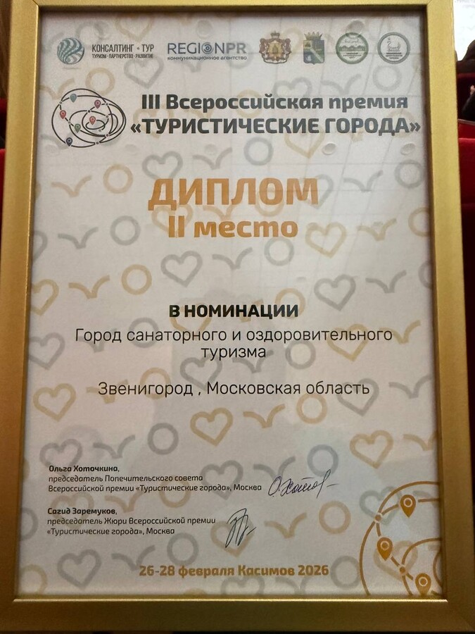 В городе Касимов Рязанской области 28 февраля состоялась церемония награждения лауреатов III Всероссийской премии «Туристические города». В число лауреатов премии вошло Подмосковье. В топе оказались и локации Одинцовского округа: так, Звенигород занял 2 место в номинации «Город санаторного и оздоровительного туризма», а Одинцово завоевал «серебро» в номинации «Город паркового туризма и смысловых пространств».