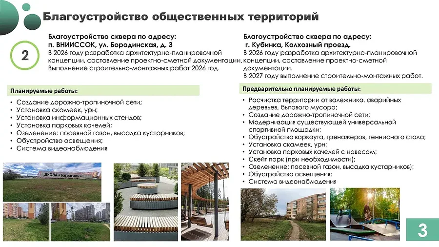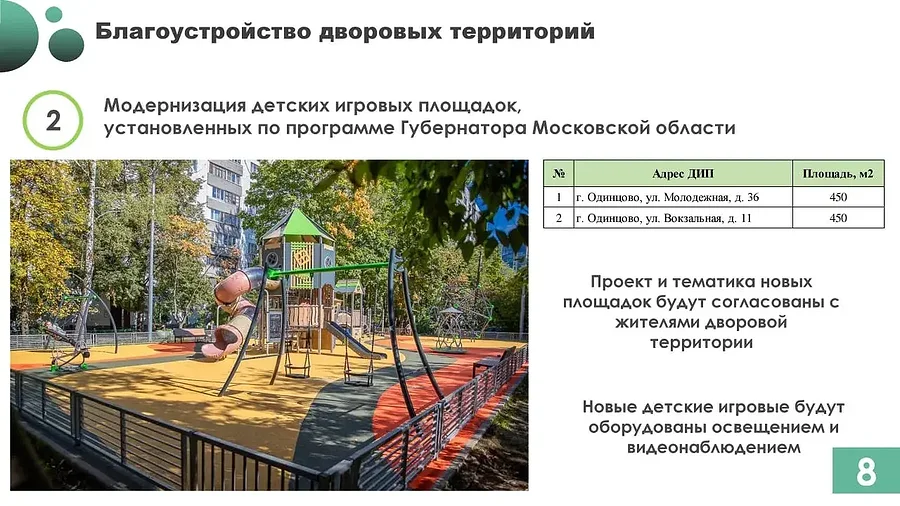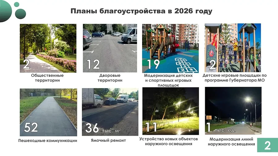 В 2026 году в Одинцовском округе запланированы масштабные работы по благоустройству дворовых территорий, общественных пространств, детских и спортивных площадок, пешеходных коммуникаций, а также модернизация линий наружного освещения